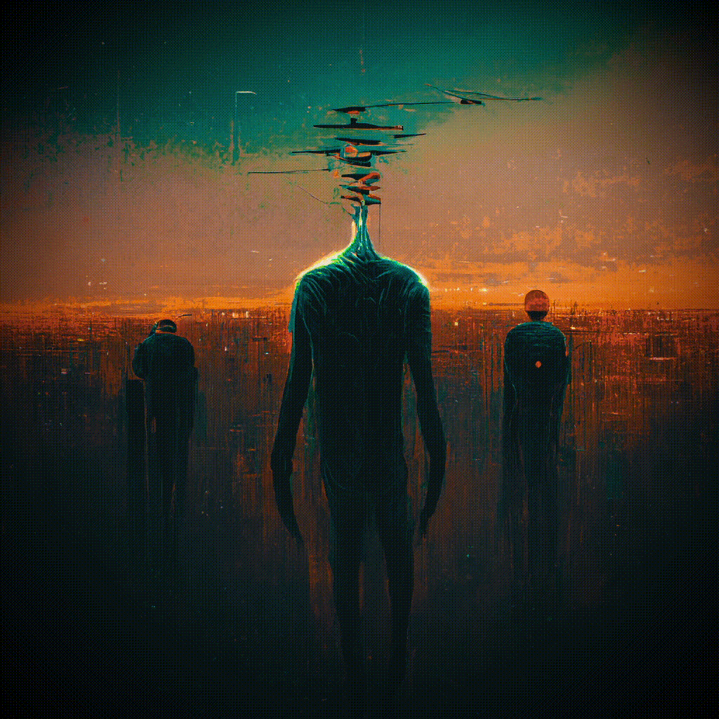 Where machine-augmented souls meet, language dissolves into pure vision. They exchange dreams pixel by pixel, weaving separate minds into a single, holy world.